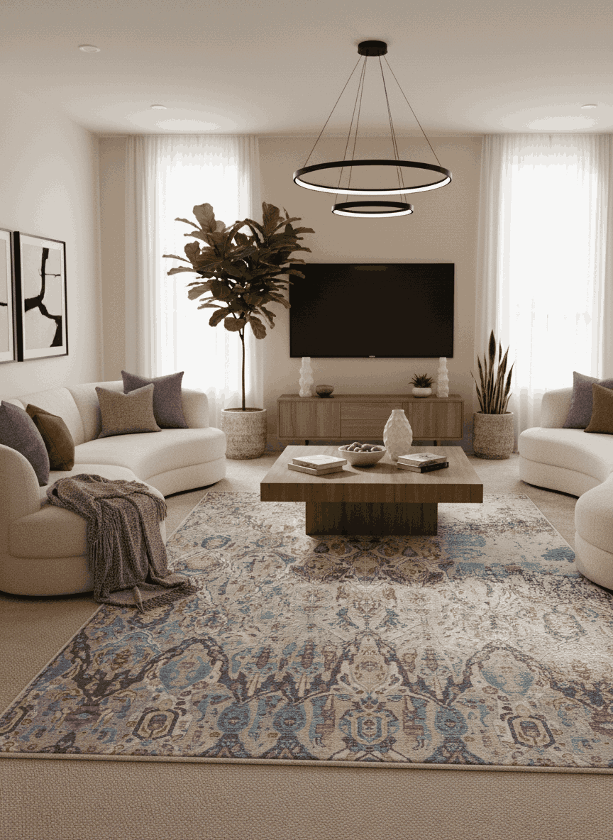 Size & Scale: Bigger is better — a rug that’s too small makes a room look disjointed. Let your furniture anchor the edges.