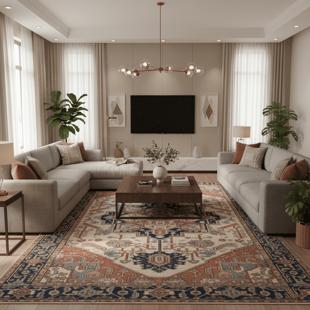 Pile & Weave: Flat-weave rugs lie low and are easier to clean; longer pile gives softness and depth but needs more upkeep.