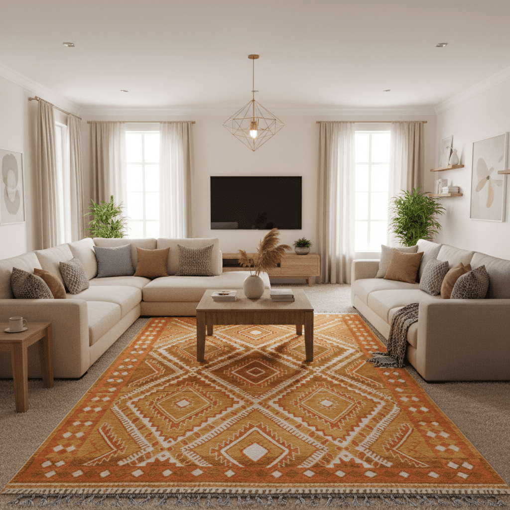 Pile & Weave: Flat-weave rugs lie low and are easier to clean; longer pile gives softness and depth but needs more upkeep.