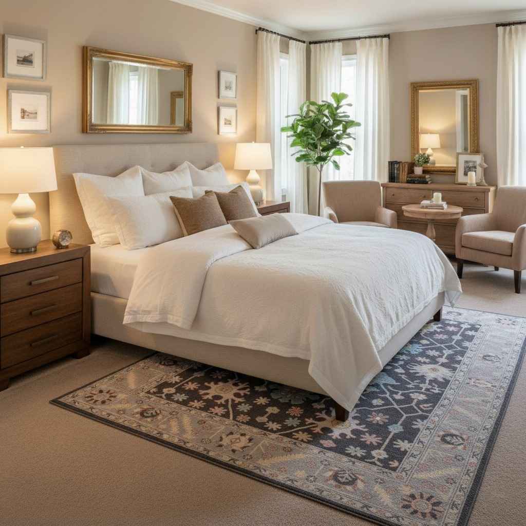 Pile & Weave: Flat-weave rugs lie low and are easier to clean; longer pile gives softness and depth but needs more upkeep.