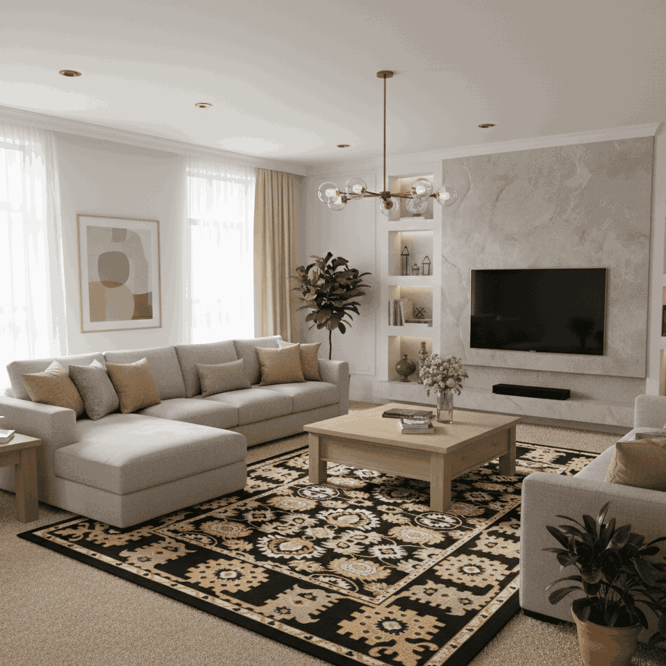 Pile & Weave: Flat-weave rugs lie low and are easier to clean; longer pile gives softness and depth but needs more upkeep.