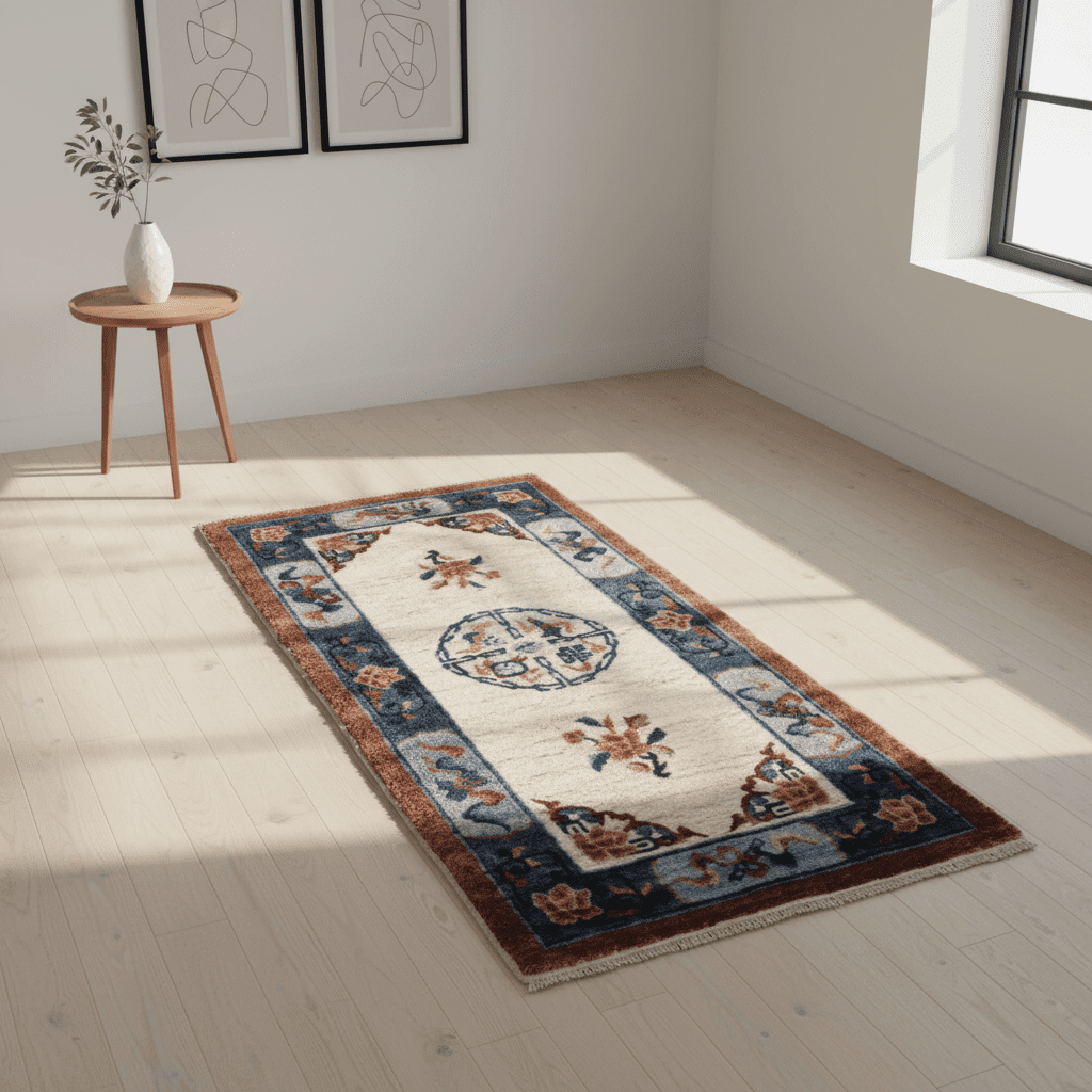 Chinese rugs are celebrated for their balance of symbolic motifs, harmonious colors, and fine weaving techniques. This rug continues that tradition, embodying the character and history that make vintage rugs so valuable. Its soft wool pile ensures long-lasting quality while enhancing the comfort and warmth of your interior.
